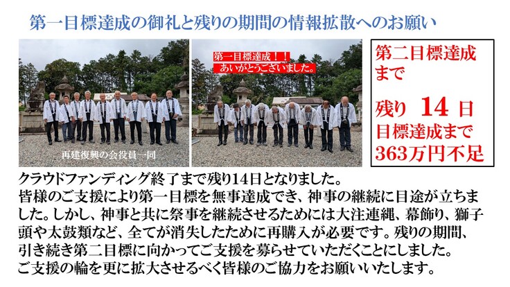 クラウドファンディング終了まで残すところ14日となりました。引き続きご支援への輪を広げるための情報拡散、宣伝活動に集中してまいります。よろしくお願い申し上げます。