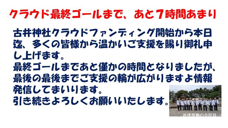 古井神社クラウドファンディングへのチャレンジも、のこりの時間も7時間余りとなりました。お陰様で多くの方々から温かいご支援と、お気持ちのこもったお言葉をいただき、再建復興の会一同感謝申し上げます。