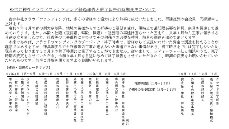 購入は2026年中を予定しており、購入ができ次第、終了報告にてご報告させていただきます。一刻も早く、皆様に再建のご報告と、残りの祭具調達のご報告できるよう努めてまいります。