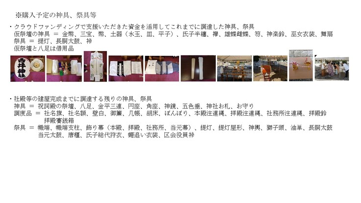 ただ、購入予定であった残りの神具、祭具に関してましては、非常に規模が大きく、収蔵場所の問題も発生することから、社殿再建後の購入に変更させていただければと存じます。予定よりも実施時期の遅延が生じてしまい、大変申し訳なく思っております。