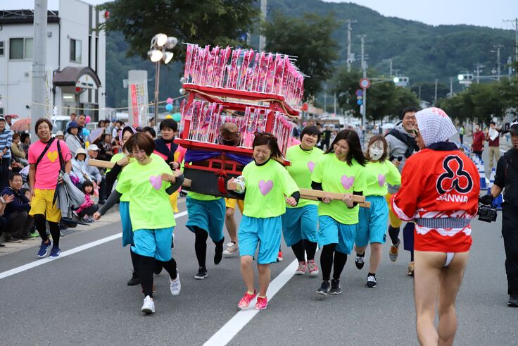 80kgのミニ神輿を8人一組で担いで開催当初は340m、現在は130mのコースを駆け上がる