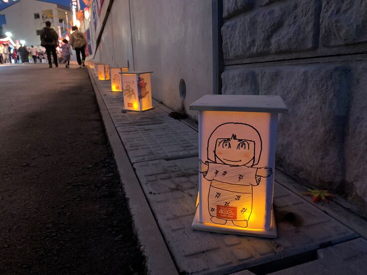 金田一温泉ブースも設けられました。灯篭を作成するワークショップブースを設置し、祭典の夜には、歩行者天国なった会場前に・・・・