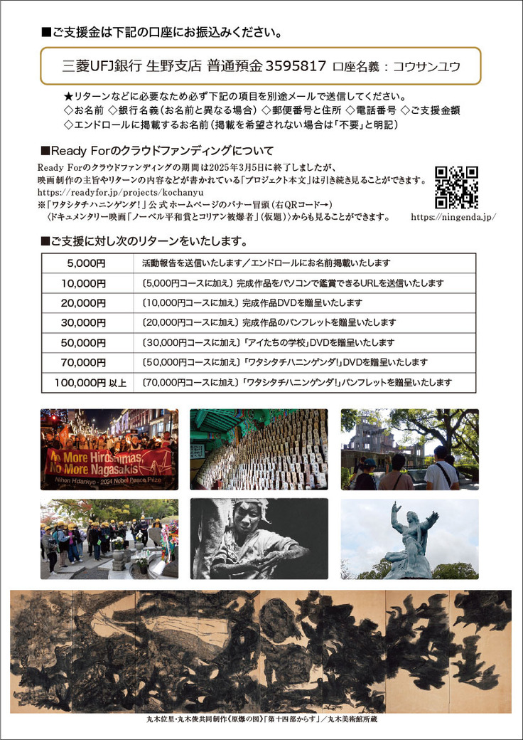 映画の制作・上映活動には多額の経費や労力が不可欠です。本作品の主旨にご賛同いただける方にはぜひ様々な形でご協力をお願いいたします。