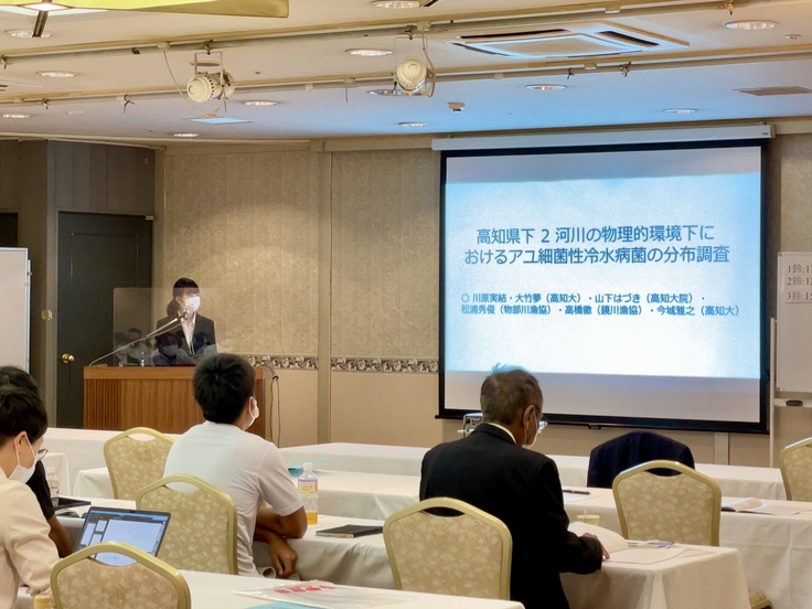 なお③~⑤に関して、下記でも述べていますが、これまで鏡川、四万十川、物部川、奈半利川などで調査経験があり、得られた研究成果を国内・国際ジャーナルに論文発表、学会に口頭発表してきました。下の写真は、令和4年度日本魚病学会秋季大会のものです。本プロジェクトを遂行する上で重要な実績となります。鏡川での研究成果は、鏡川漁業協同組合HPをご覧ください。