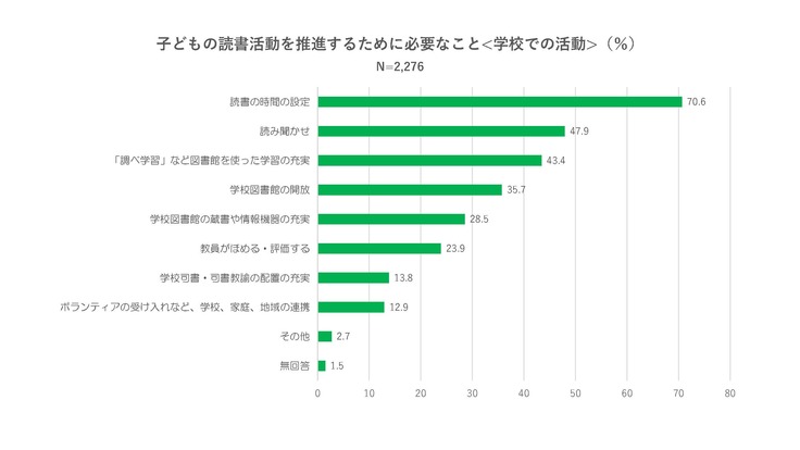 文部科学省の保護者への調査によると、子どもの読書活動推進のために必要な地域での活動として、「読書に関する広報活動の充実」に3割以上の人が回答しており、情報へのニーズが高くあることがわかります。