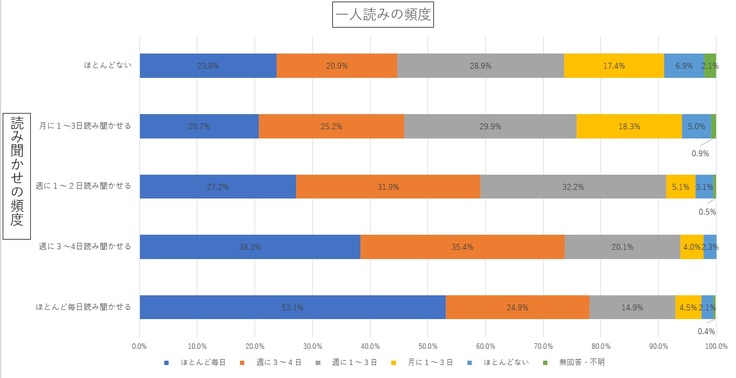 また、読み聞かせの頻度が高いほど、一人読みの頻度も高くなるという調査データもございます。