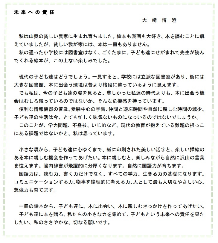 子どもたちの読書を親しむ機会を増やし、子どもたちの未来を応援できればと思っています。