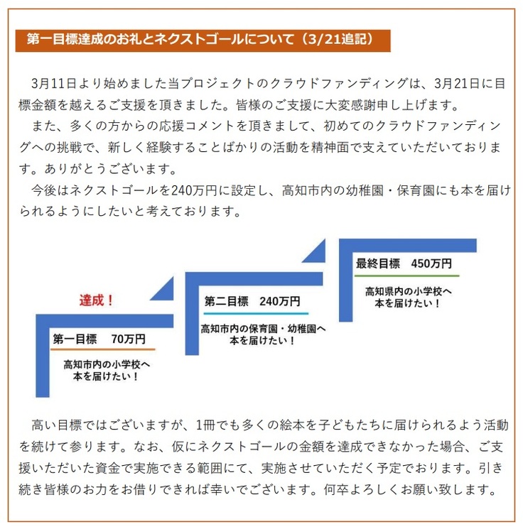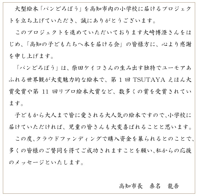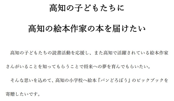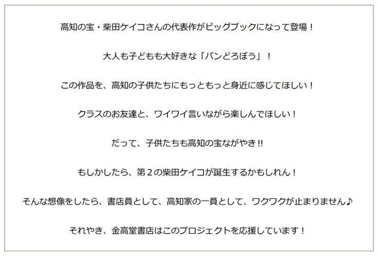 まずは高知市内の小学校へパンどろぼうビックブックを寄贈することを第一目標としております。