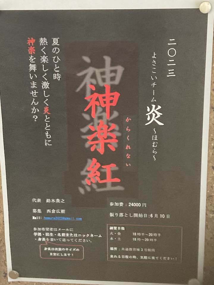 学生チームの紹介です。炎(ほむら)です。旗を使った表現に特徴があります。高知大学次世代地域創造センターの玄関扉を鏡がわりにして、よく練習をしています。