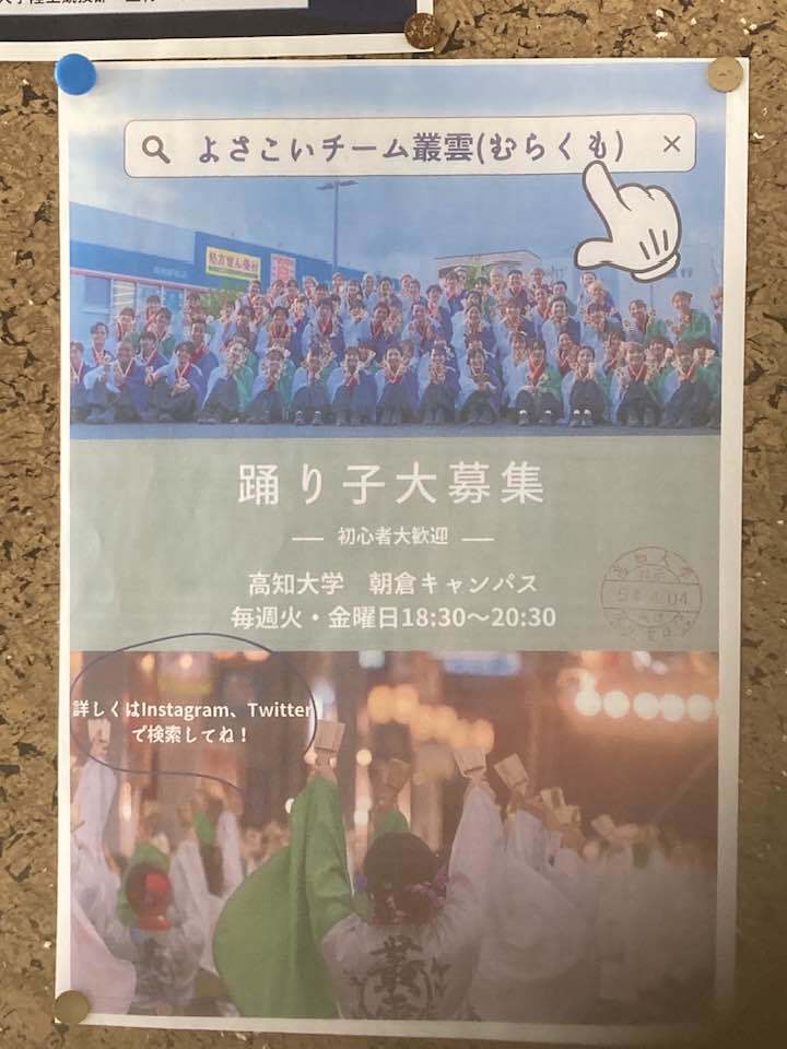 コンパスという商店街活性化とよさこいで活躍する団体のなかで、叢雲というチームを立ち上げています。今日も練習予定があります。
