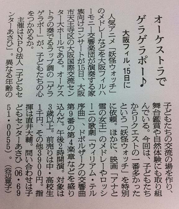 2/4(水)の朝日新聞夕刊4面にて「オーケストラファミリーコンサート」をご紹介いただきました。引き続きご支援よろしくお願いいたします。