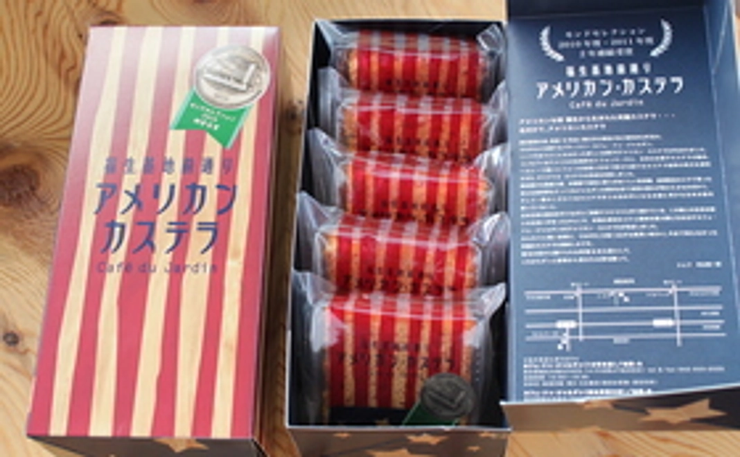 ■ スイーツの名店”カフェ・ドゥ・ジャルダン”オリジナル「アメリカンカステラ5個入り」をお送りします。米軍基地のある福生で生まれた絶品カステラです。(http://cafe-du-jardin.com/)