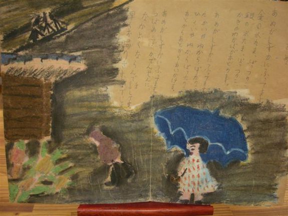 「こどもの美術館 大展覧会」にお持ちくださった絵から、今回はすてきな詩画をご紹介いたします。 描かれたのは昭和23,4年頃。小学1年生の女の子の作品です。青い傘をさした女の子の上にこんな詩が添えられています。 ”あめが しずかにふっています。 金の水たま ぽっつりこ。 銀の水たま ぽっつりこ。 かきのわかばがおどります・・・」 素直な言葉で綴られた詩を読みたい方は、どうぞ9月7日からはじまる「こどもの美術館大展覧会」にお越しください。