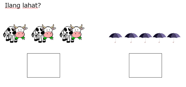 質問は「Ilang lahat?=全部でいくつですか?」ということなので、牛さんのところに「3」、傘のところに「5」が書ければ正解です。