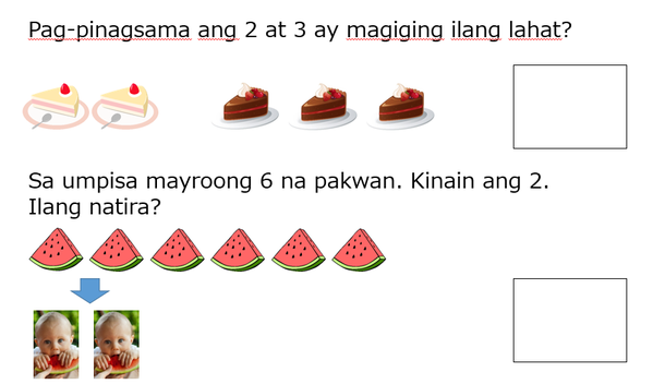 (ケーキの問題はショートケーキ2つとチョコレートケーキ3つを合わせる足し算。スイカの問題は最初6切れあったスイカを2切れ食べて、残りはいくつ?という引き算の問題です。)