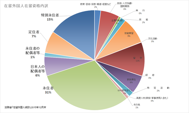 時代はすでに「デカセギ」から「テイジュウ」の時代へと変化しており、日本国内に暮らす外国籍の方々の滞在資格内訳を見ても、特別永住・定住者・永住者や配偶者等、長期滞在が可能な在留資格を有する方々が6割を占めていることがわかります。