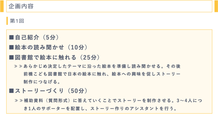 絵本には、色んな言葉の表現や言い回しや色とりどりの絵が使われており、自由に想像力をふくらませたり、自分を自由に表現することができるという良さがあり、そこから繰り広げられる世界観一つ一つが唯一無二なのです。自由に想像したり、表現したりすることの楽しさを感じながら、表現の仕方の一つのツールとして日本語を用いることで、外国にルーツを持つ子どもたちが自然と言語の壁を乗り越え、日本語に慣れ親しむことにつながると考えています。