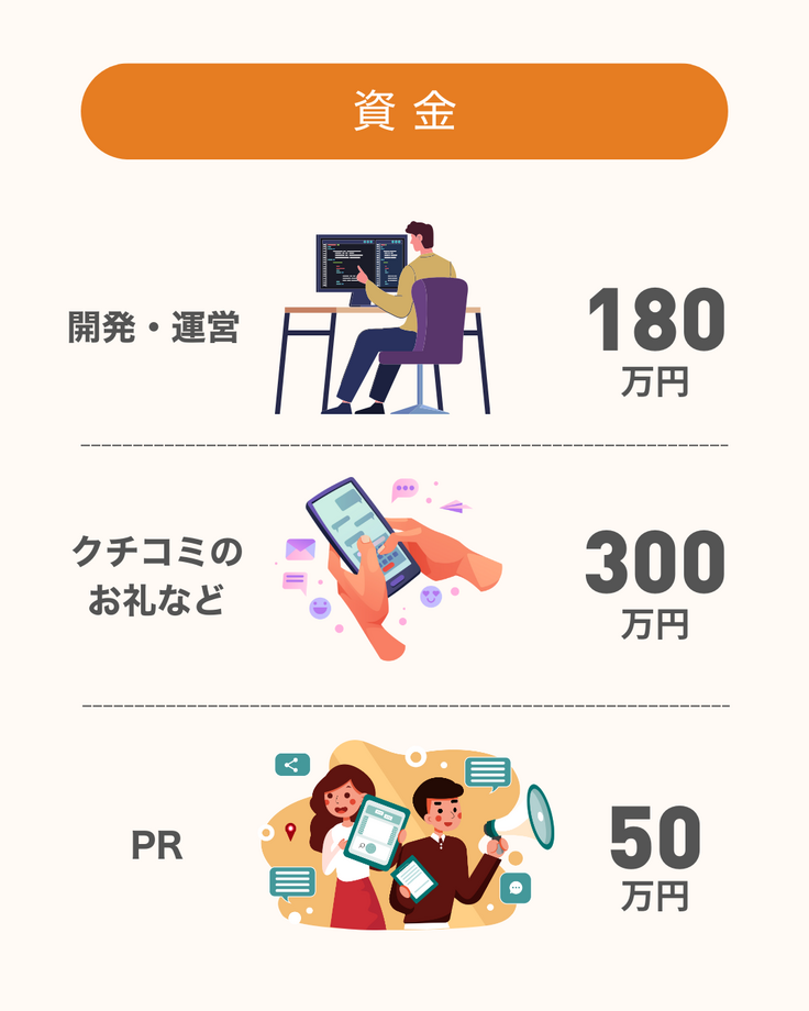資金は全額開発費に充てさせて頂きます。プロジェクト実施完了日までにはクチコミ投稿ページの準備と保育の声の開発を行い、サービスローンチのために必要な作業を進めてまいります。