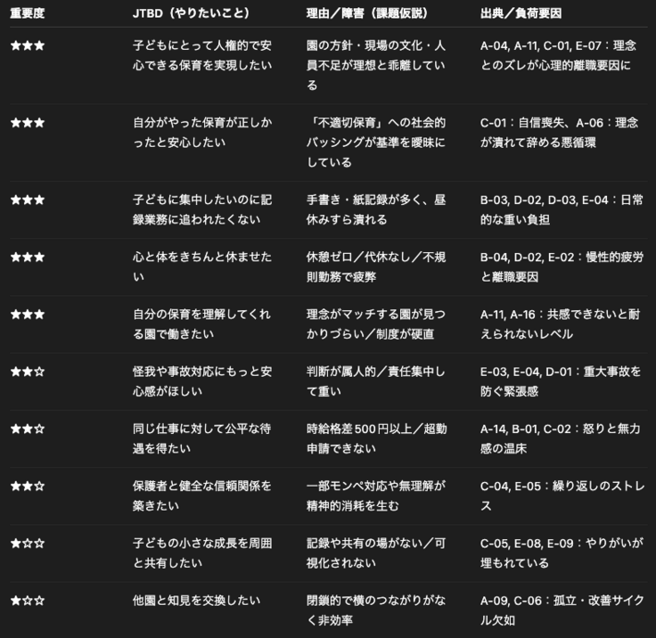 保育士の方々にヒアリングを行うと、数多くの課題を知る事が出来ました。