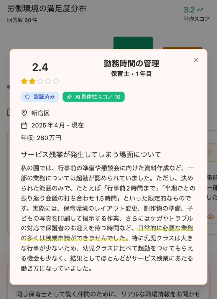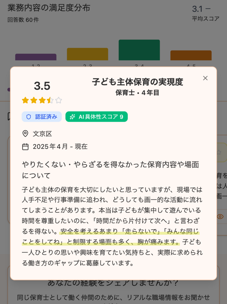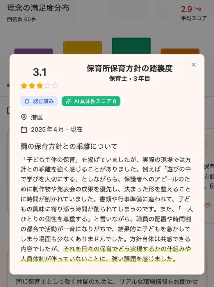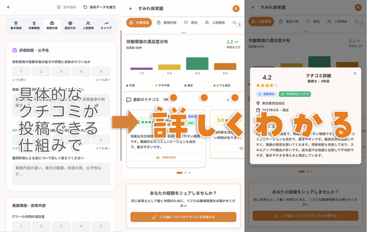 保育の声では保育士が現場の労働環境・理念・人間関係・やりがいなどを具体的に書ける環境を提供すると同時にAIでクチコミを建設的な内容に収束させていきます。
