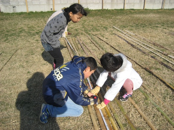 事前に裂き10mの長さになるよう繋げ合わせた竹に、