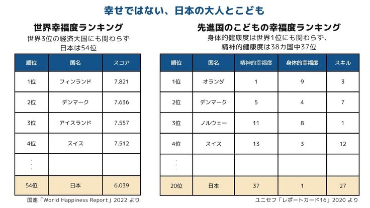 こどもたちも同様で、身体的健康度は世界1位ですが、精神的健康度は調査対象の世界38カ国中37位です。少子化は留まるどころか加速しており、今後は経済的豊かさを失っていくのに伴って社会や個人の課題も増えていくことが予想されます。