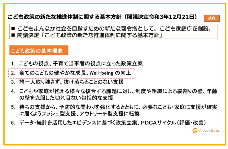 実際、「こども家庭庁」の創設にあたっても、こども政策の基本的な理念のひとつとして、“全てのこどもの健やかな成長、well-being の向上”が掲げられています。