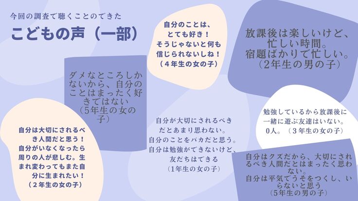また、こどもへ行ったインタビューからは、のびのびとしたほほえましいこどもの声もあった一方で、きびしい状況にあるこどものリアルな声を聴くこともできました…。