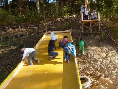 (すりきず公園の滑り台、スライダーで遊ぶこどもたち)
