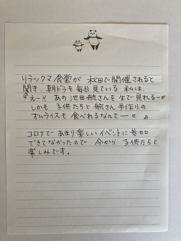 7/18に池田航さんのリラックマオムライスイベントに、こども二人と参加しました。4歳の娘は「リラックマがかわいい!」と喜び、6歳の姉は目の前の池田さんに話しかけられ照れていました。俳優として活躍されていますが、食の問題を自分ごととしてとらえているところが印象的でした。