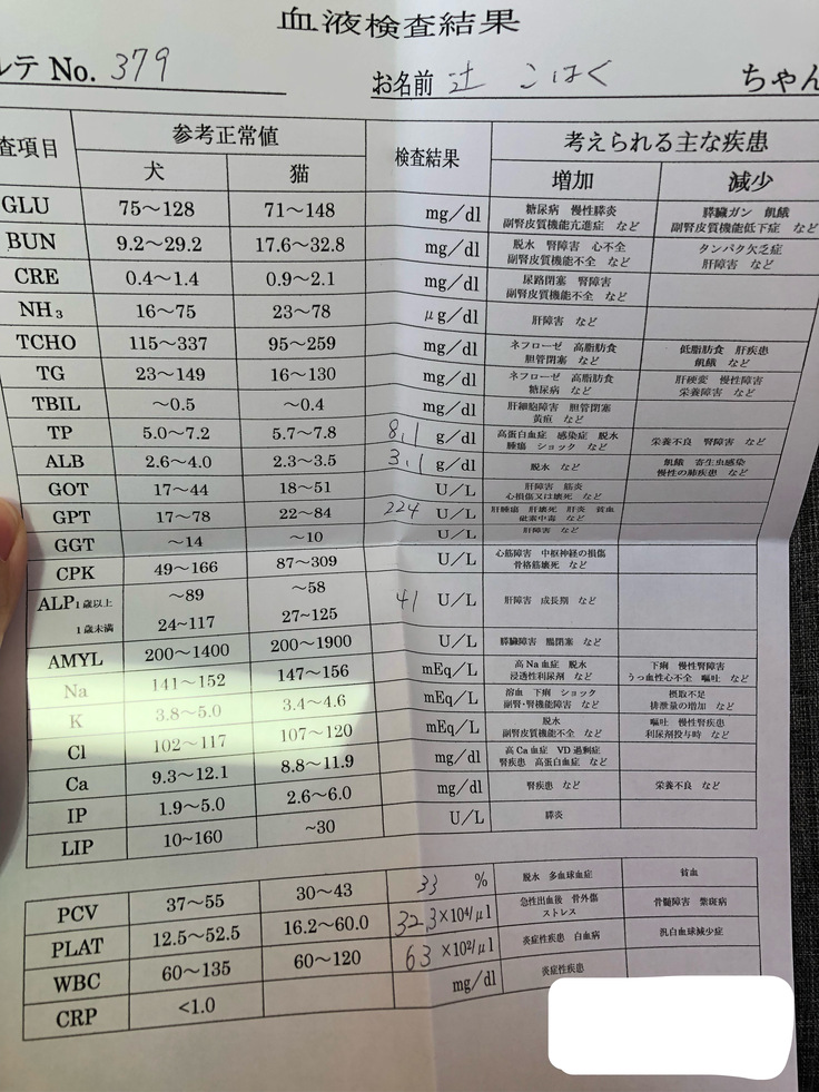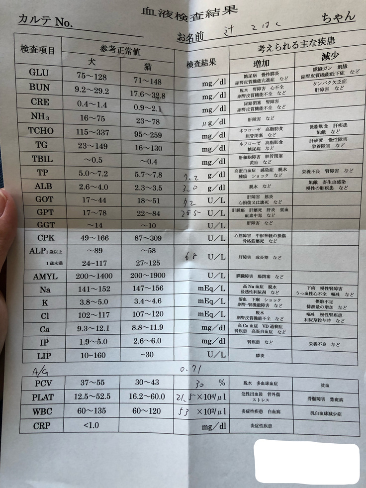そこから1週間ほど経った2月24日。ついにこはくの食欲の減退が見え始めました。まったく食べないというわけではないですが、大好きなカリカリを食べなくなり、猫缶やちゅーるしか食べないようになってしまいました。すぐに病院に連れていき、血液検査をしていただいた結果がこちらです。↓
