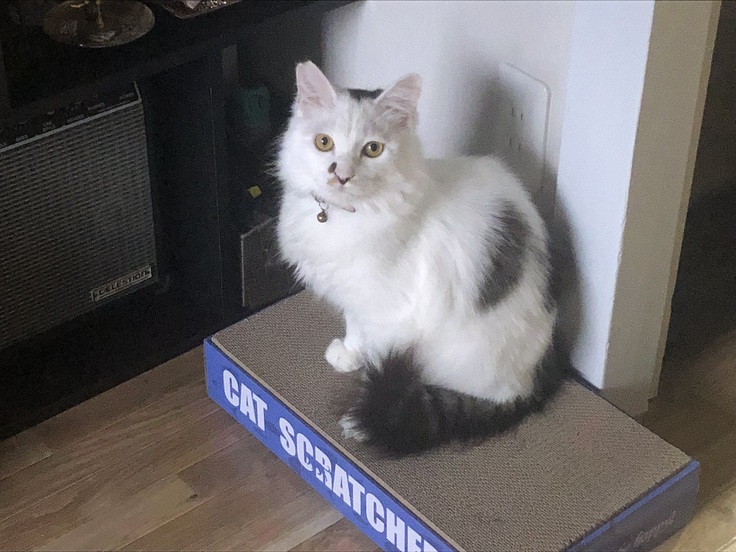治療が終了したこはくは、FIP発症以前のように元気になりました。これは、治療終了のお祝いにと買ってあげた爪とぎに座り、ご機嫌な様子のこはくです。↓