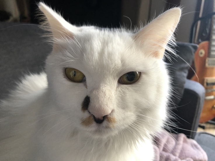 そして3月に入った頃、こはくはだんだんと食欲がなくなり、猫缶を食べることもなくなってしました。動き回ることも少なくなり…以前のように先住猫ちゃんと走り回ることはなくなっていました。いよいよFIPの再発を疑い注射の再開をすべきか、と考え始めたちょうどその時、こはくの目の異変に気が付きました。↓