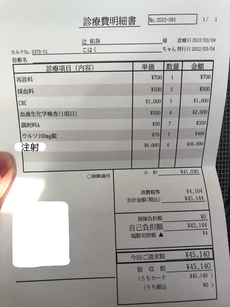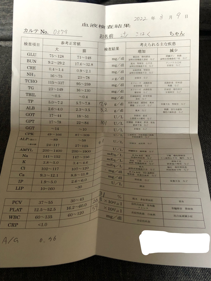 注射での治療を再開してから6日目になる昨日(3月9日)、血液検査をしていただくために病院に連れて行きました、その結果がこちらです。↓