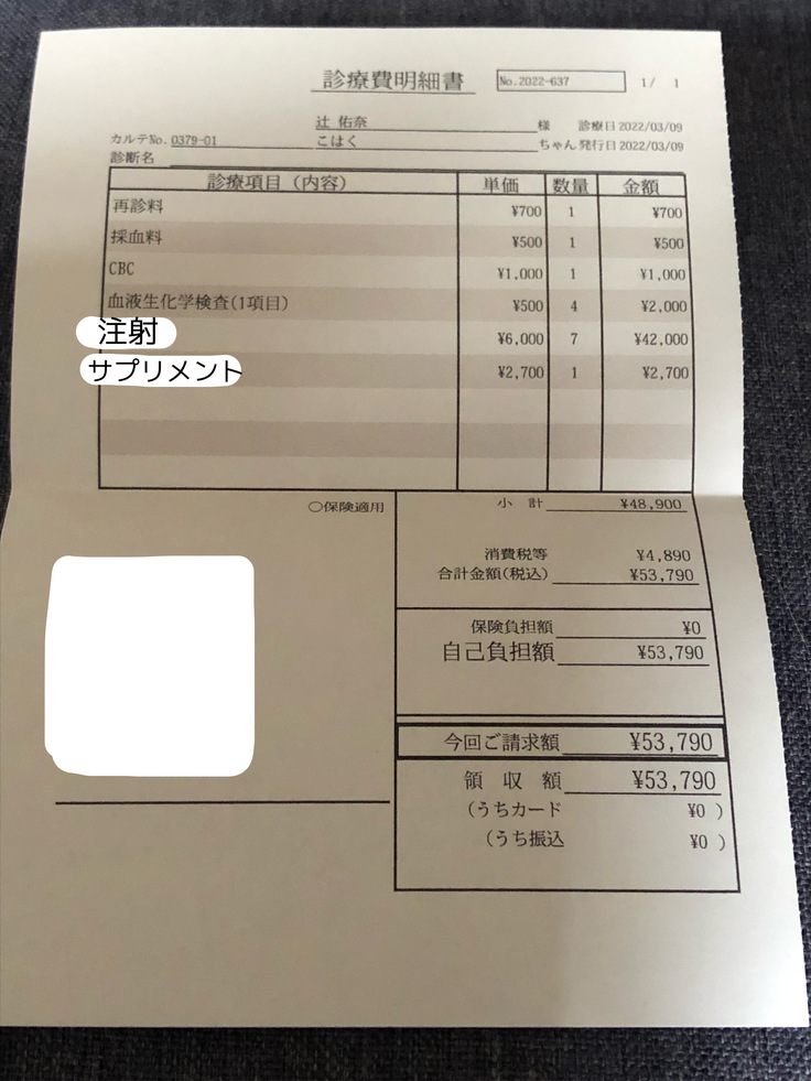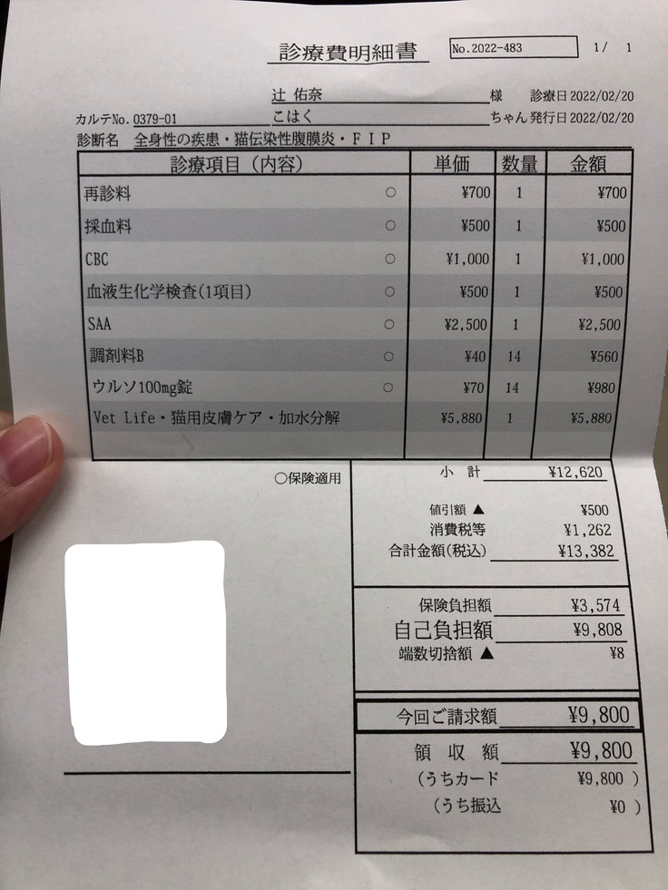 前回の注射での治療の際にかかった治療費は、注射の代金に加え、血液検査代、FIPに効くといわれているサプリメント代など…すべてを計算すると761,830円でした。前回の治療開始当初は、治療費はだいたい650,000円ほどは想定してもらえれば、というお話を病院の方からいただいていましたが、こはくの場合、食物アレルギーや下痢などFIP以外のトラブルも何度かありましたので、当初の予定を大幅に上回ってしまいました。