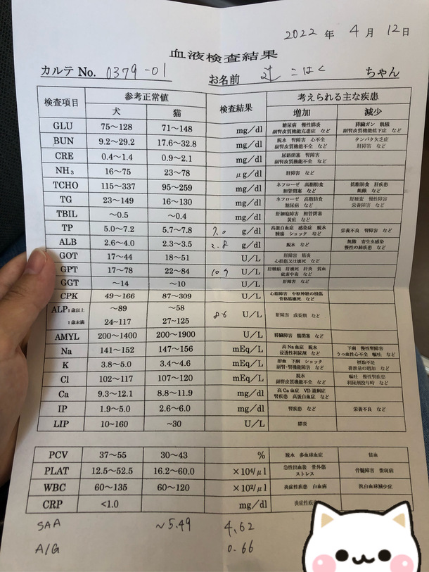 A/G比の値は前回よりも少し良くなっていたのですが、SAAも基準値内にはおさまってはいますが下がりきらず、肝臓の値(GPT)については前回に引き続き基準値を超えています。