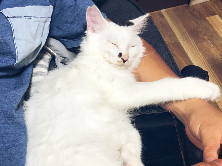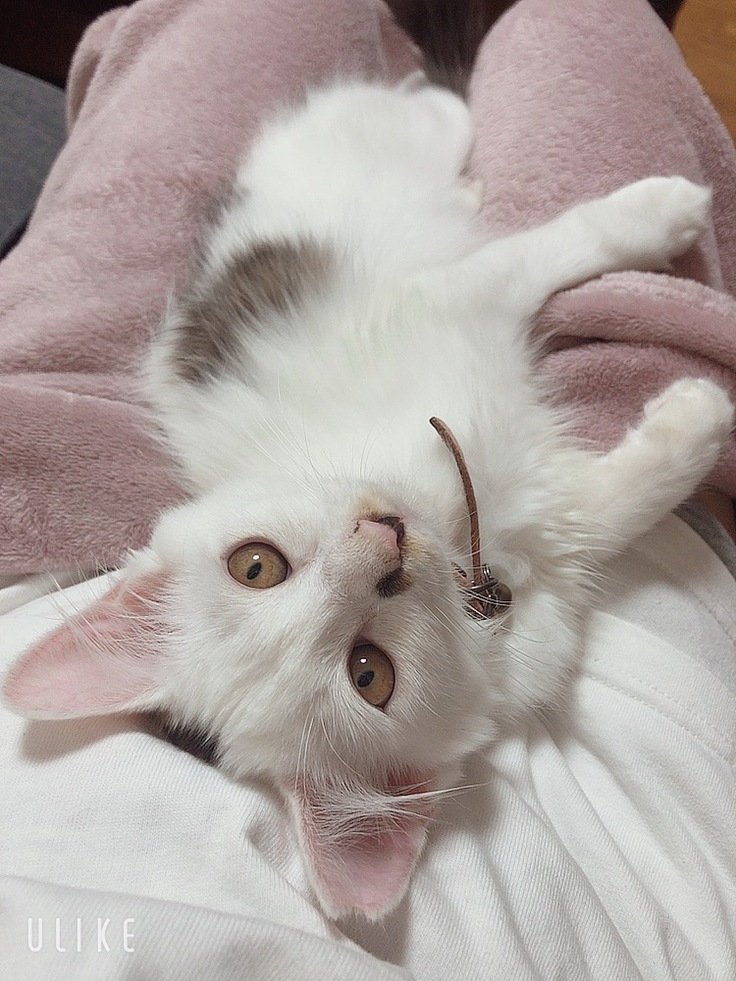 保護された当初のこはくは痩せていて、猫風邪も患っていたようです。保護してくださった方が病院に連れて行ってくださり、猫風邪の治療やノミ取り、ワクチン接種、去勢手術まで受けさせてくださいました。私がこはくを引き取った7月5日には、猫風邪もすっかり治ってとても元気な状態でした。この子を引き取ると決めたときから名前をどうしようかと毎日考えていましたが、ひと目見たときにこの子は「こはく」だなと思いました。目が琥珀のように綺麗な黄金色をしていたのが印象的だったことと、「小さくて白い」という見た目をかけました(かなり安直ですが…)。