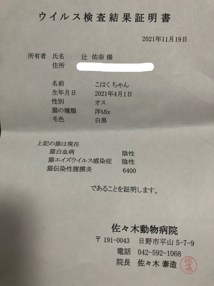 11月18日。自宅から一番近い病院にこはくを連れていきました。先生に診ていただくと、耳と歯茎に黄疸が見られるのが気になるとのことで、血液検査をすることになりました。それに併せてエイズや白血病、そしてFIPの検査をしていただきました。