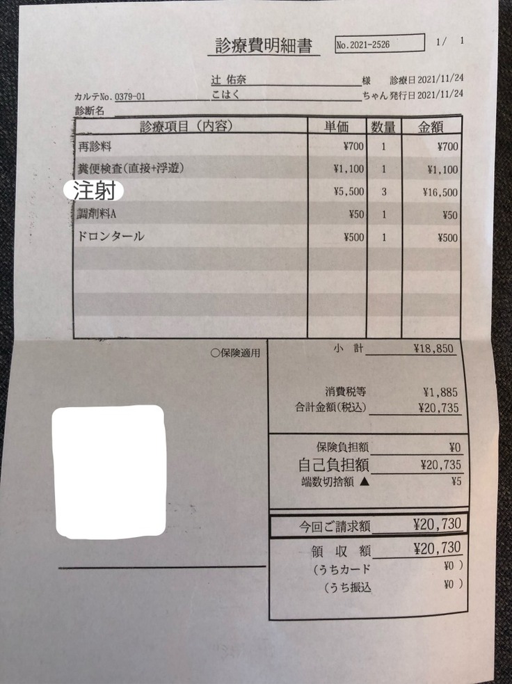 こはくの様子は、明らかに前日よりもぐったりしていました。相変わらず食欲はなく、お水も自ら飲みに行くことはほとんどなくなっていました。熱も40度近くまで上がり、呼吸もしんどそうにしていました。この日も点滴とビタミン剤、肝臓のお薬、抗生剤を打っていただきました。FIP自体に直接作用するお薬はありませんが、FIPは炎症性の病気であるため、それを緩和させるためにステロイドを打っていただきました。また、糞便検査をしていただくとやはり回虫がいたので、併せて駆除の薬も飲ませてもらいました。何本も注射を打たれてつらそうに鳴いているこはくを見るのは、どうしても心が痛かったです。先生と今後どうするかについて相談し、こちらの病院では未認可の薬は取り扱っていませんでしたので、通院で対症療法を行っていくか、入院して対症療法を行っていくか、旦那と話し合って決めるようにと言われました。