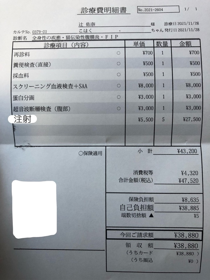 11月20日。今まで通っていた病院にまずは連れていき、注射での治療を考えていることをお話しました。すると先生は、「大変だと思うけど頑張ってね、この子も一緒に頑張ってくれるはず」と快く仰ってくださいました。ですので、今回こちらの病院では点滴とビタミン剤のみ打っていただき、その足でFIP治療の注射を取り扱っている病院へと向かいました。そちらで先生のお話をお伺いすると、やはりFIPだろうというお話で、同時にエコーでこはくのお腹を見てもらいました。その結果、腹水が溜まっていたのでウエットタイプと診断されました。余命はやはり長くても1週間ぐらい、12月を迎えることはできないだろうと言われました。1週間くらい前までは何事もなく元気に過ごしていたこはくが、こんなにみるみるうちに衰弱し、まもなく亡くなってしまうかもしれないという現実は受け入れがたいものでした。幸い、注射での治療は間に合うというお話でした。ですので私達はこの日から注射での治療をお願いすることに決めました。