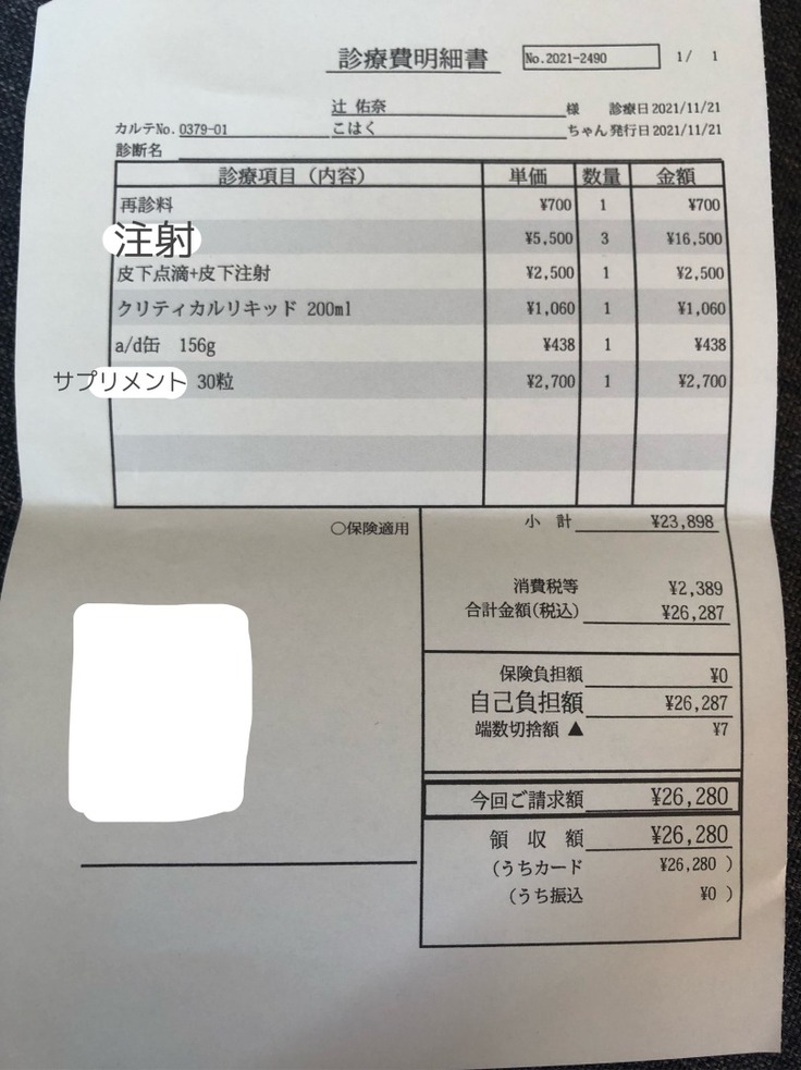 その背景にはなりますが、こはくの治療費が当初の予定(650,000円)より遥かに跳ね上がっていることがあります。予想よりもこはくの回復力はとても大きく、食欲も以前のように戻り、体重も発症当初から1キロ以上増えました。そのため、注射の薬剤の量が増え、治療費もかかってしまっています。