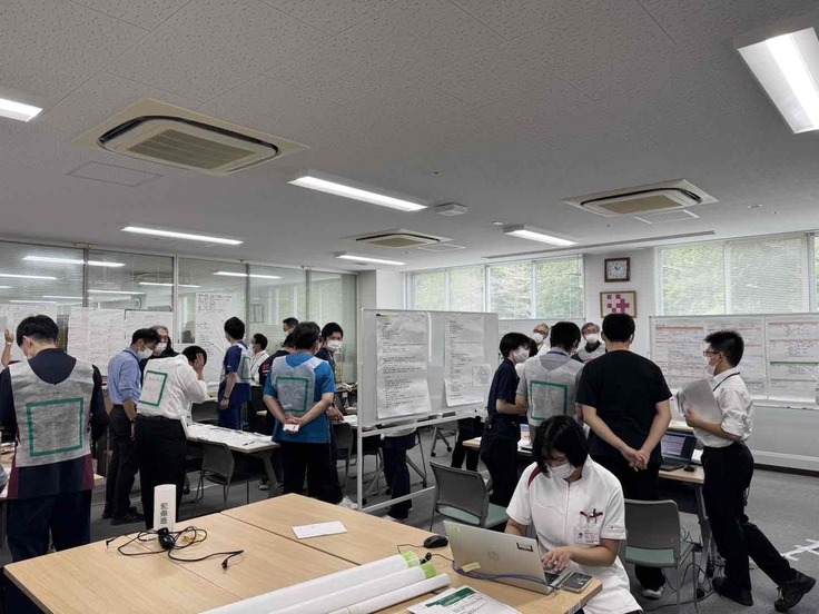休日に大地震が発生した想定で、仮本部及び本部の立ち上げに実践形式で取り組みました。