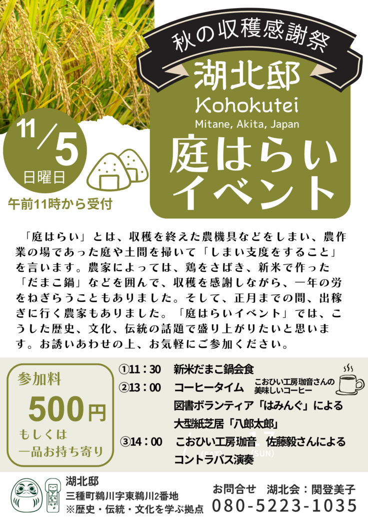 「庭はらい」とは、収穫を終えた農機具などを姉妹、農作業の場であった庭や土間を掃いて「しまい支度をすること」を言います。農家によっては、鶏をさばき、新米で作った「だまこ鍋」などを囲んで、収穫を感謝しながら、一年の労をねぎらうこともありました。そして、正月までの間、出稼ぎに行く農家もありました。「庭はらいイベント」では、こうした歴史、文化、伝統の話題で盛り上がりたいと思います。
