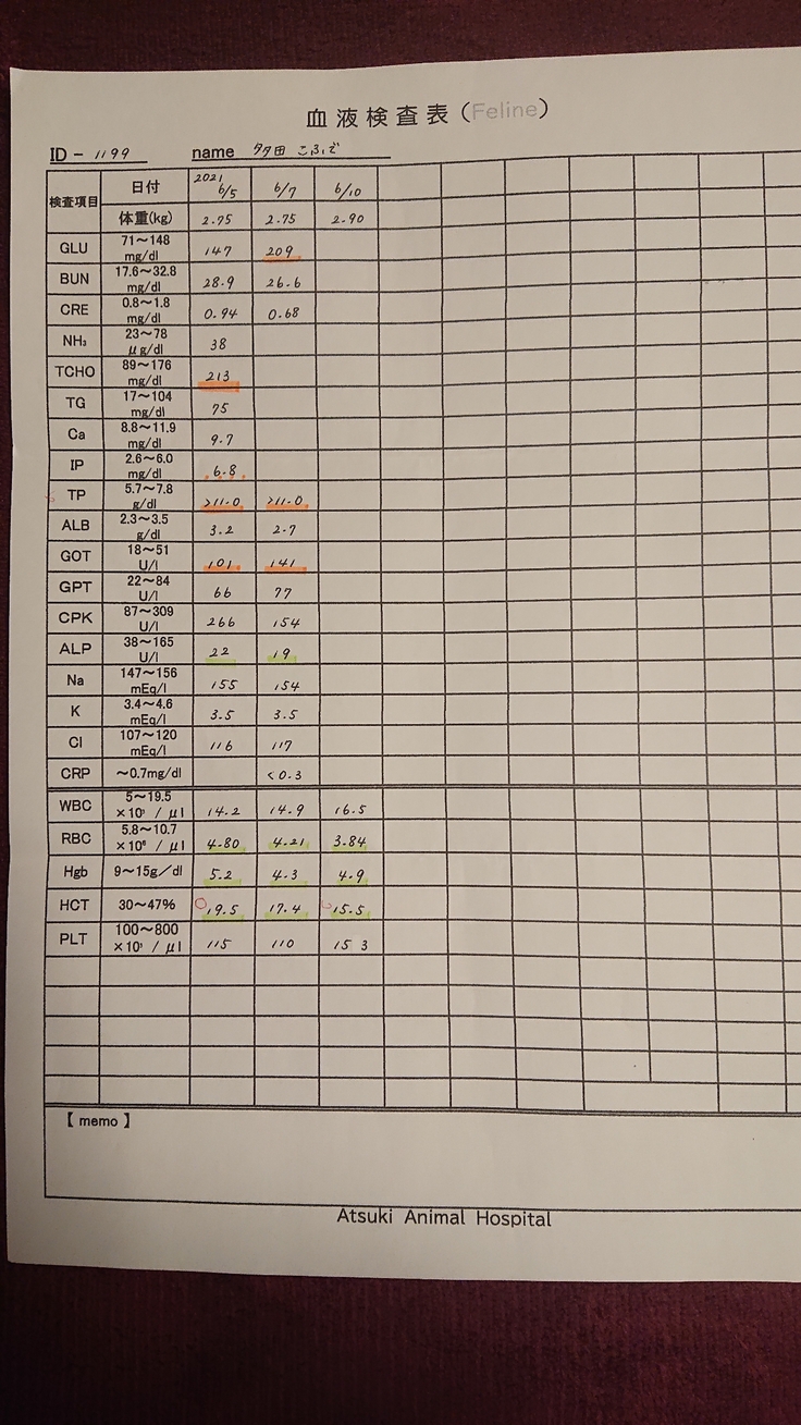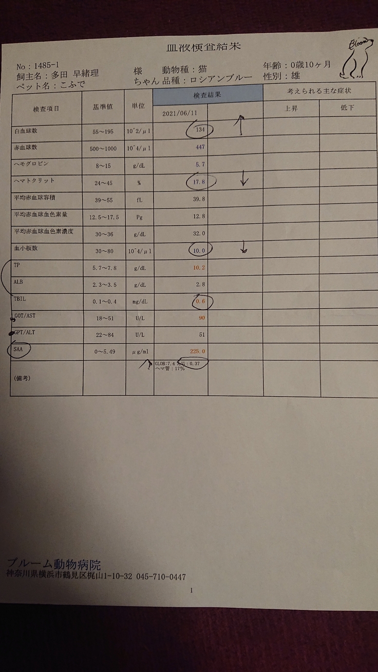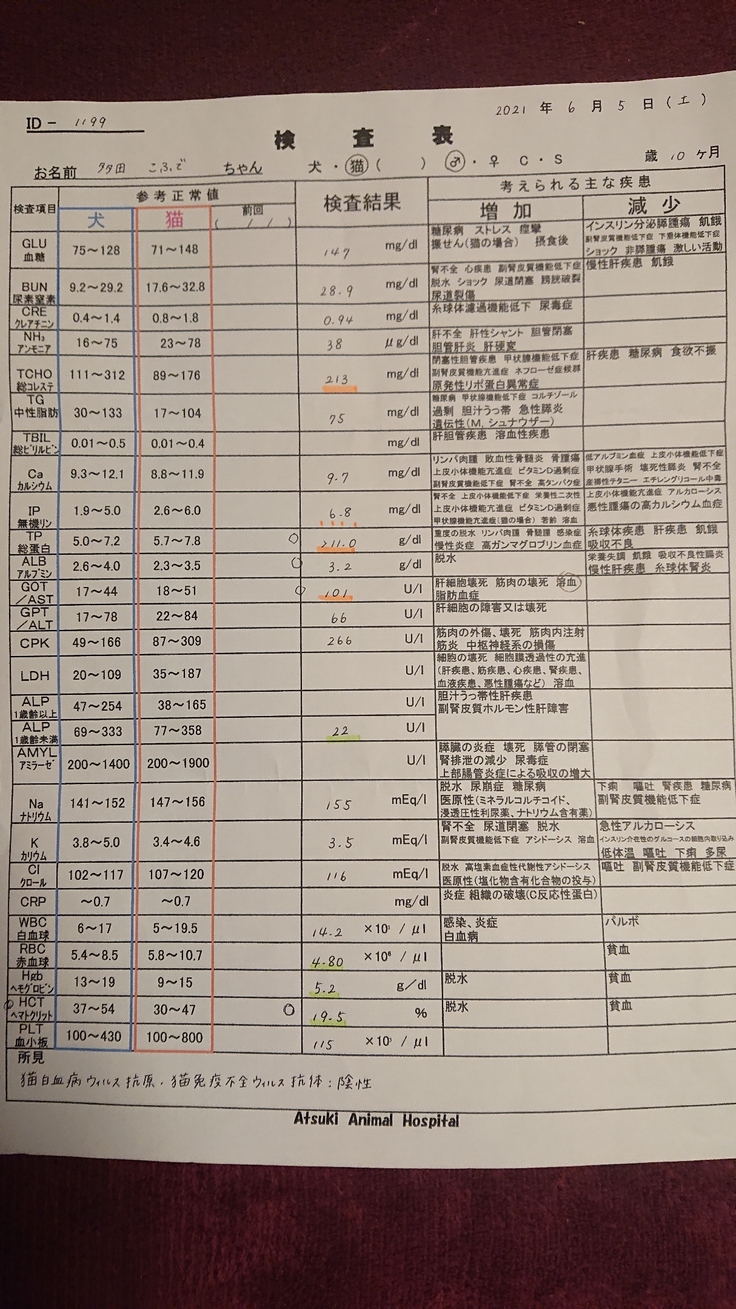 最初の血液検査の結果と明細書。(まだFIP(猫伝染性腹膜炎)の検査結果前のものですが参考までに。)