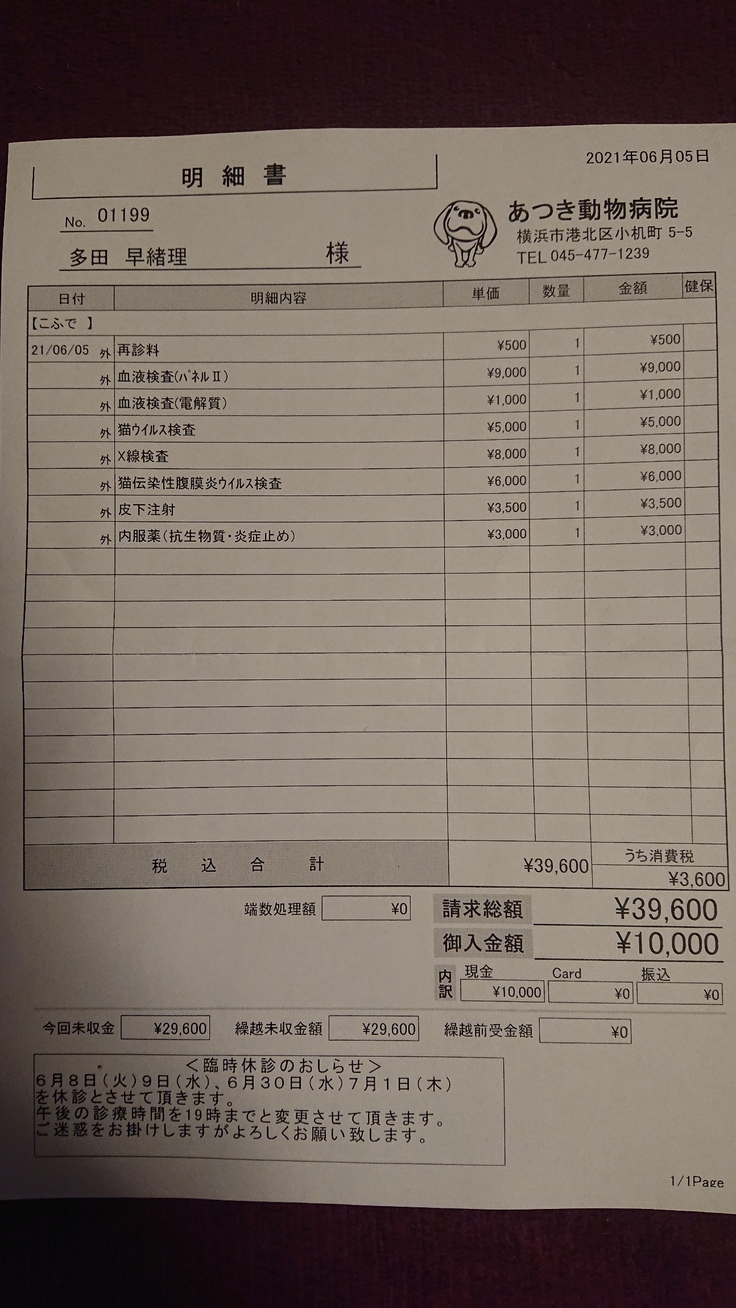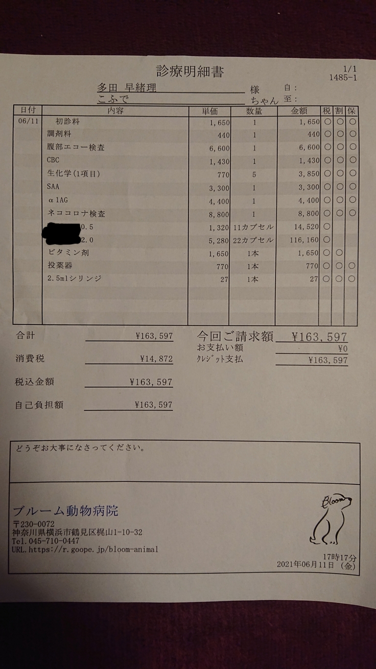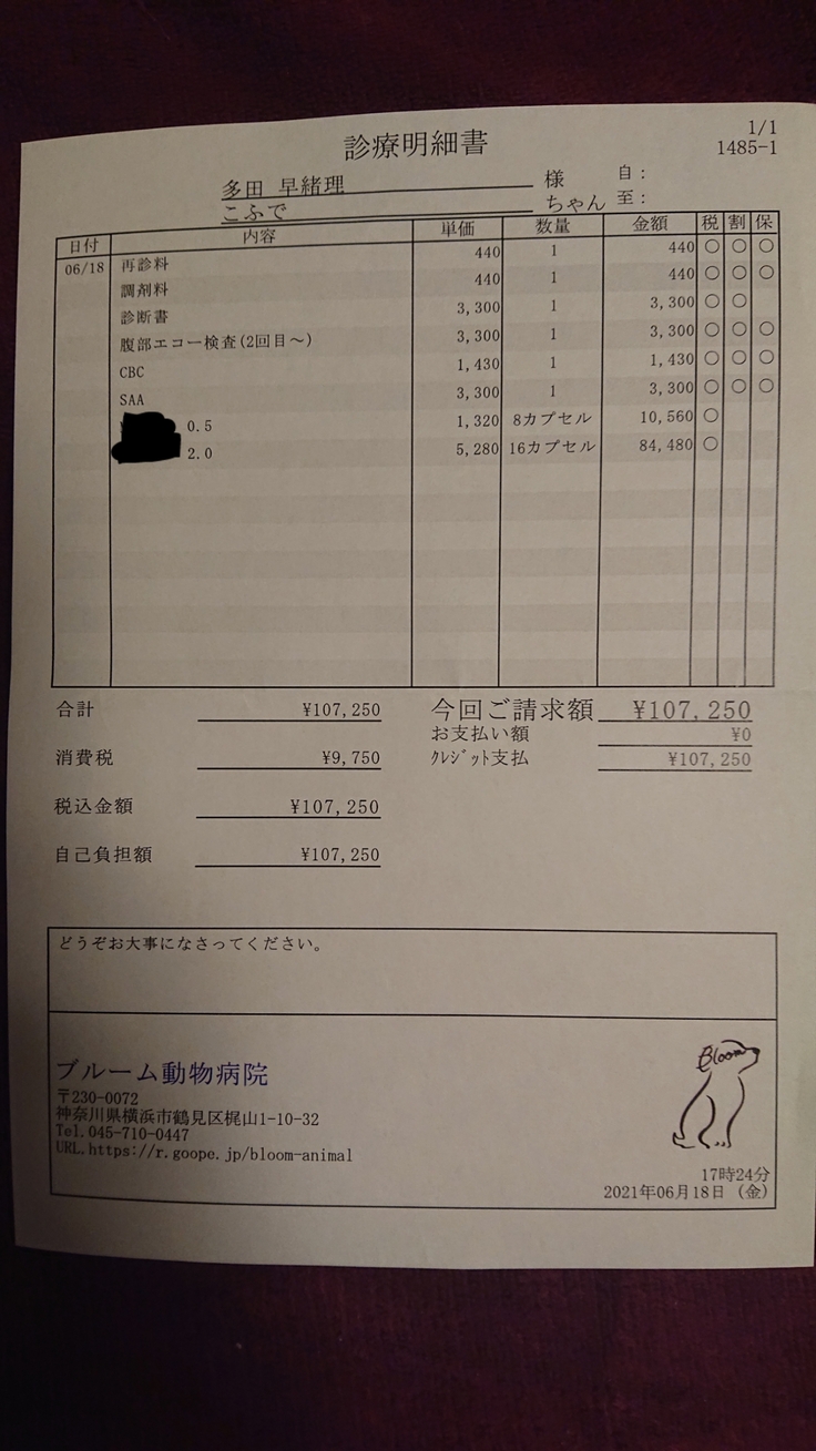 全てこれまでにかかったこふでくんの治療費(お薬代、検査費)にあてさせていただきます。