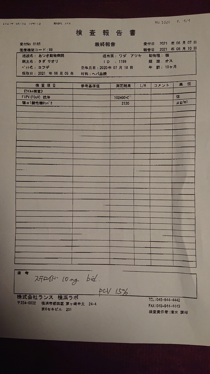 先生が他の数値も気になるのと言うのでFIP(猫伝染性腹膜炎)の検査を依頼。