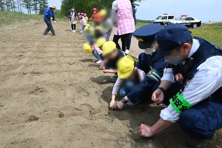 当初は、弊社と帯広警察署の皆様や大正交番とでひまわりの種をまき、啓発運動を展開しておりました。近年では、地域の保育園児の皆様やJAFの皆様のお力もお借りしながら、幸福駅の花壇に、沢山のひまわりの種をまいて育てております。