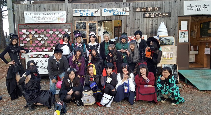 ハロウインにちなんだ衣装(手作りのものもあります)を身にまとい、秋の幸福駅や紅葉を背景に写真撮影をおこないます。
