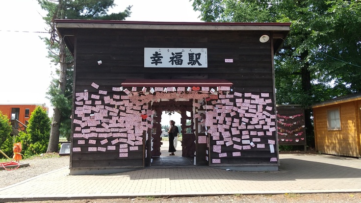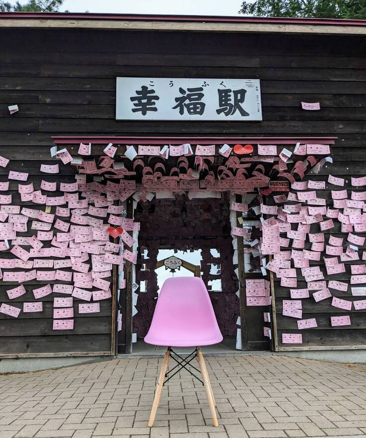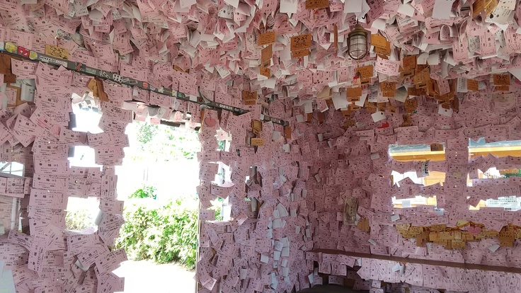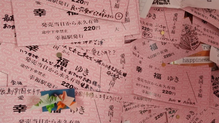 幸福駅駅舎の中は、ピンク色一色に染まってます。皆様の想いがたくさん込められた大きな切符が一面に貼られてます。