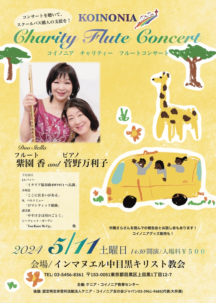 今週5/11土曜日に、紫園香さんと菅野万利子さんによるチャリティコンサートがインマヌエル中目黒キリスト教会で開催されます。